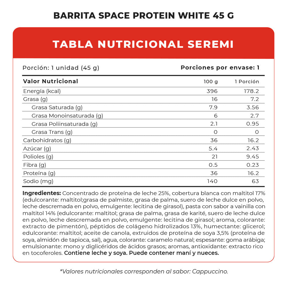 La Space Protein White Coated ofrece un aporte excepcional: 35 g de proteína por cada 100 g, acompañados de solo 36 g de carbohidratos totales, incluyendo aproximadamente 3–4 g de azúcares y hasta 20 g de polioles, asegurando una carga energética mantenida con bajo impacto glicémico. Además, contiene solo 14 g de grasa por 100 g, lo que la hace ideal para nutrir y controlar macros sin sorpresas.
