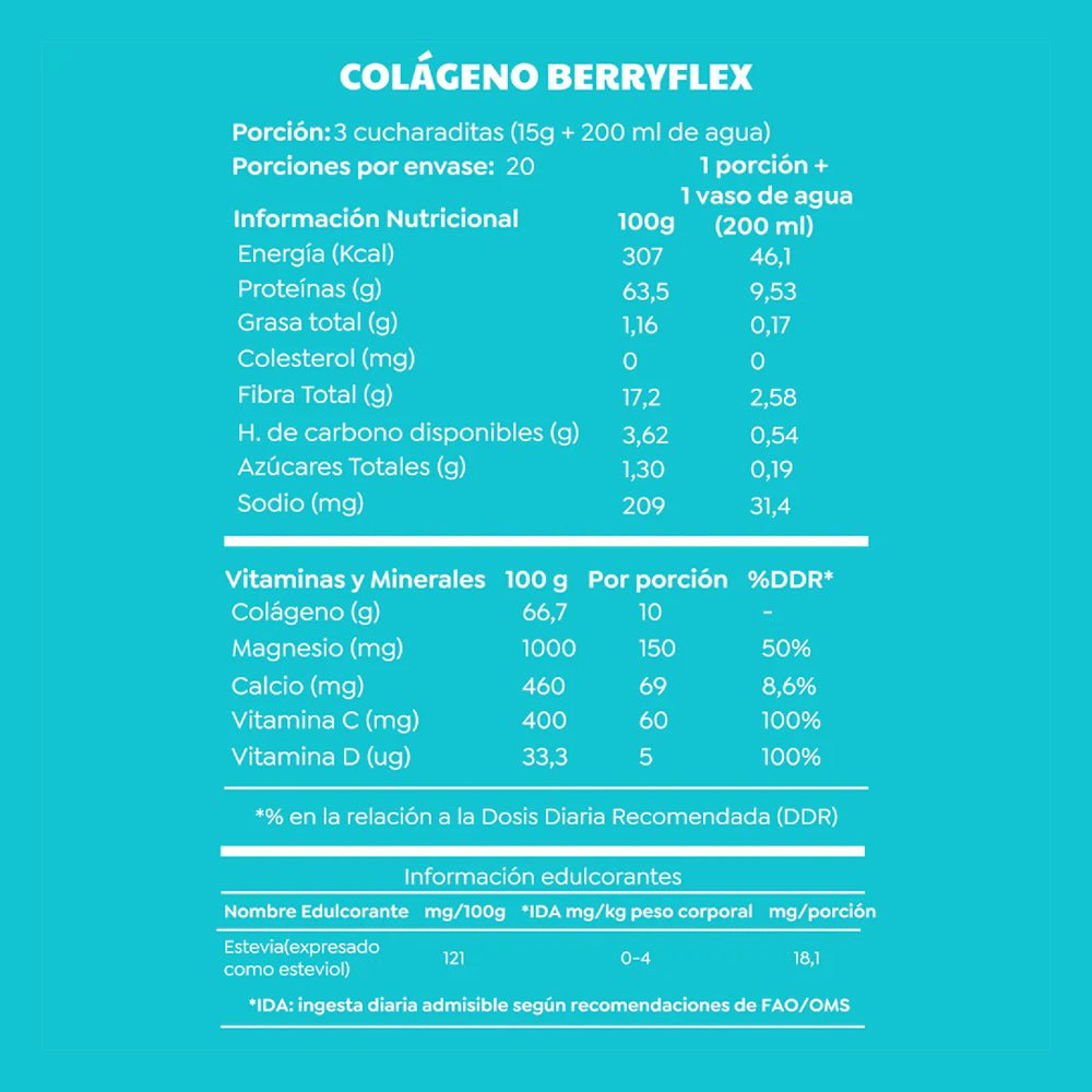 El Colágeno BerryFlex es un suplemento premium diseñado para mejorar la movilidad articular, fortalecer piel, cabello y uñas, y aportar antioxidantes naturales provenientes de frutos rojos.