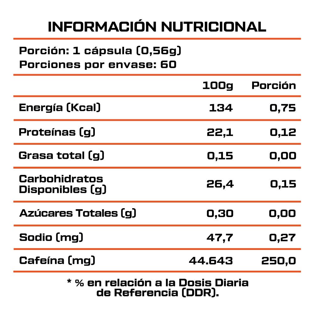 Rápido suministro de energía entregado por la cafeína más pura y concentrada del mercado, que asegura el mejor rendimiento físico, lucidez y energía.