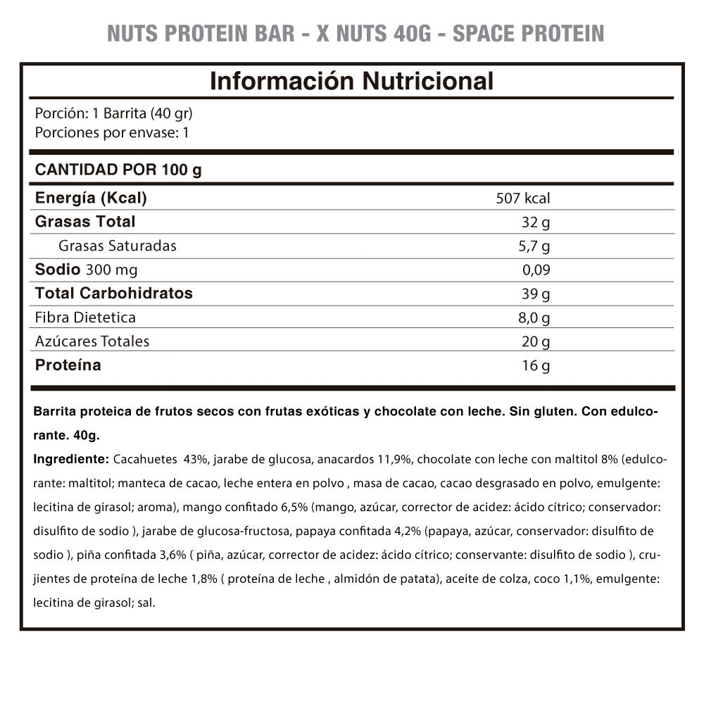 Cacahuetes 43%, jarabe de glucosa, anacardos 11,9%, chocolate con leche con maltitol 8% (edulcorante: maltitol; manteca de cacao, leche entera en polvo, pasta de cacao , cacao en polvo reducido en grasas, emulgente: lecitina de girasol; aroma), mango confitado 6,5% (mango, azúcar, corrector de acidez: ácido cítrico; conservante: bisulfito de sodio ), jarabe de glucosa-fructosa, papaya confitada 4,2% (papaya, azúcar, conservante: bisulfito de sodio ), piña confitada 3,6% (piña, azúcar, corrector de acidez: ácido cítrico; conservante: bisulfito de sodio ), extruido de proteína de leche 1,8% ( lecheproteína, fécula de patata), aceite de colza, coco 1,1%, emulgente: lecitina de girasol; sal de mesa Puede contener otros frutos secos y soja.
