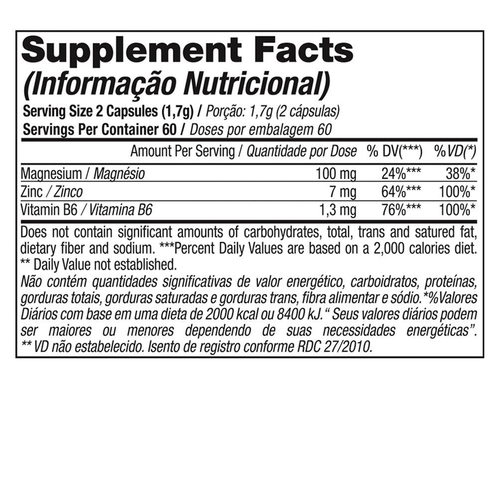 Este suplemento, que se presenta en cápsulas, contiene una poderosa fórmula de Zinc, Magnesio y Vitamina B6. El producto está especialmente elaborado para aumentar la fuerza, mejorar la recuperación post-entreno y apoyar con la conciliación del sueño.